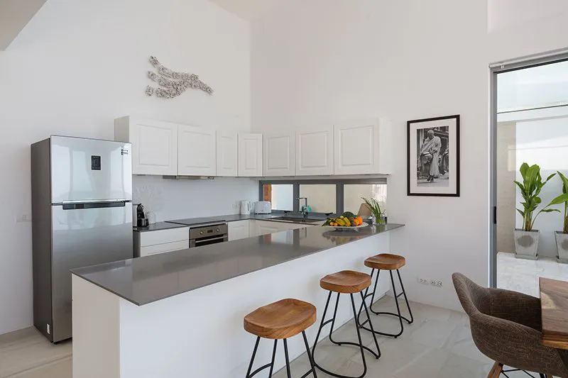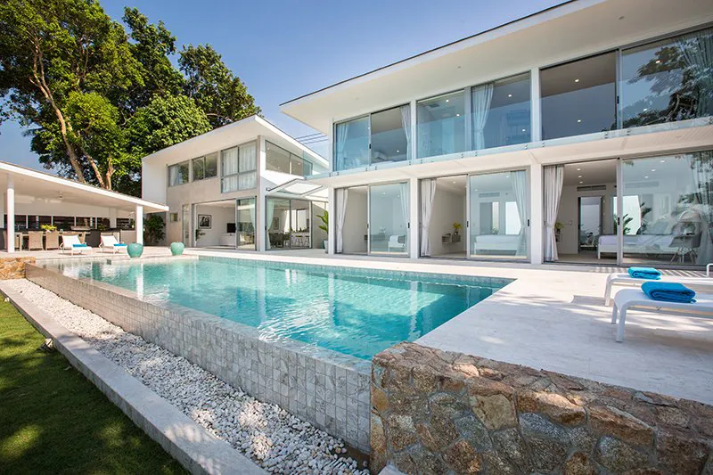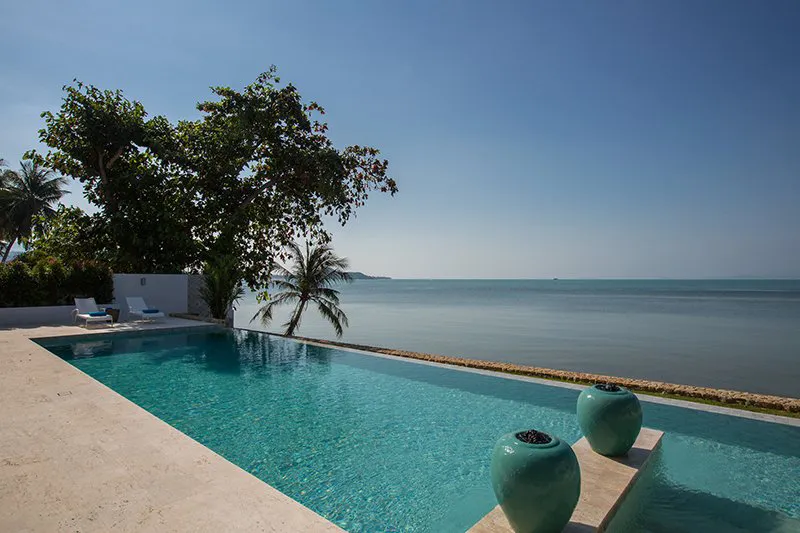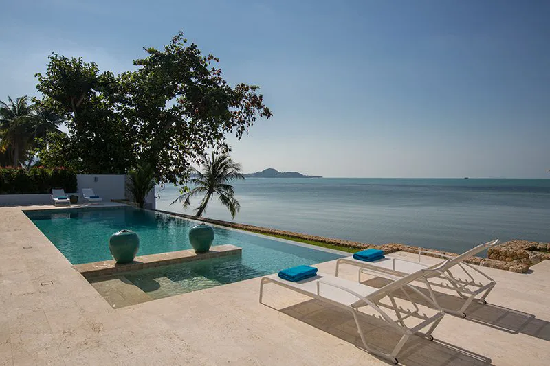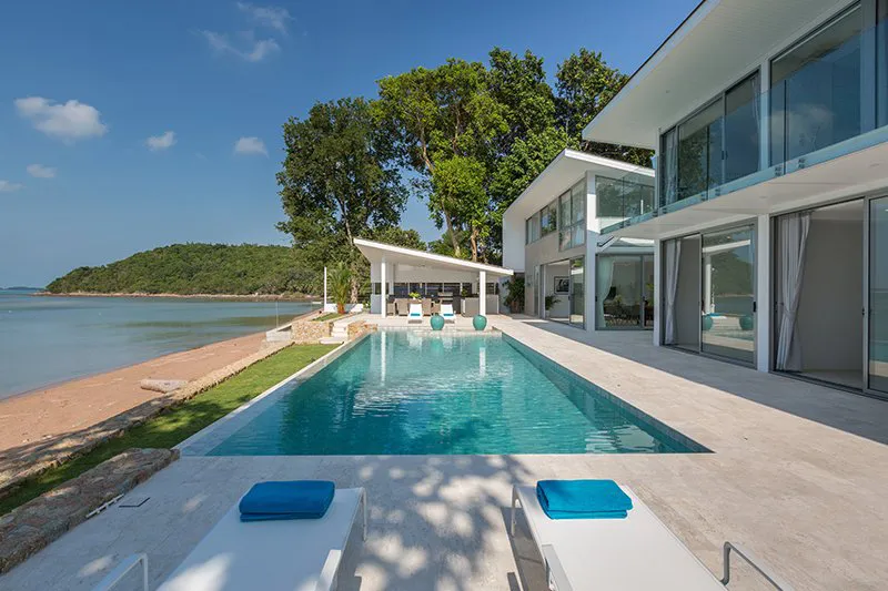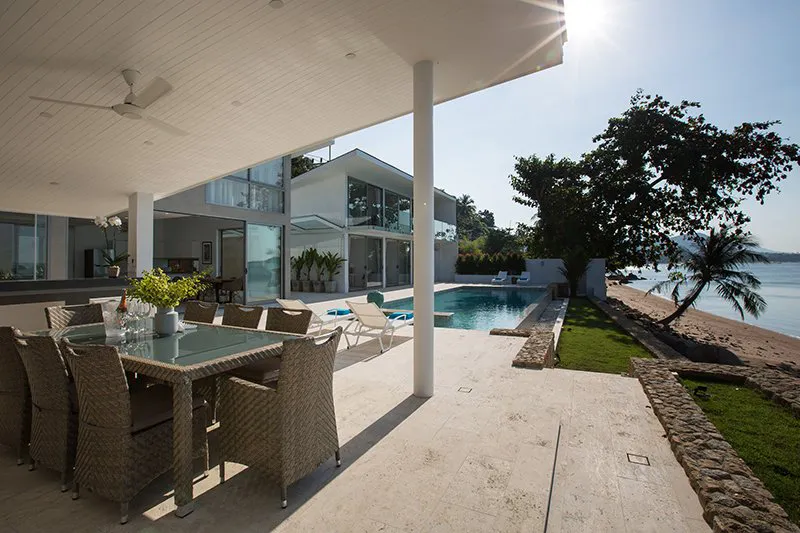 This gorgeous 4 + 1 bedroom villa is located right on Bangrak beach, only a couple of minutes away from Fisherman’s Village. The villa comes with two separate buildings. The building on the right offers 3 bedrooms with en-suite bathrooms on the ground floor and a master bedroom with family room on the second floor. The other building offers the spacious living, dining and kitchen area on the ground floor with the maids room on the second floor. The maids room comes with a kitchen and bathroom which can easily be converted to another master bedroom. Outside you find a large infinity pool and outdoor Sala with dining, kitchen and BBQ area overlooking the ocean.
